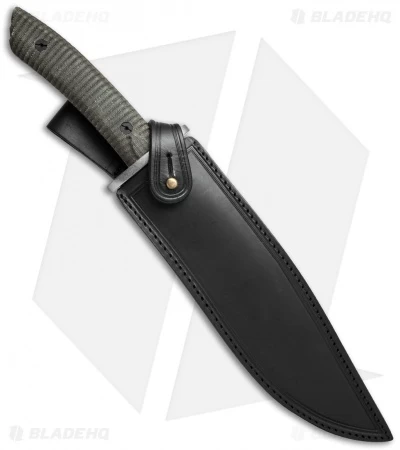 Pictures may not fully capture the epic size of the El Gigante fixed blade, but in hand and on task this knife demands respect. It’s a beast of a knife with a stunning polished, stonewash finished Böhler N695 steel blade that’s full-tang and tapered at the pommel. The handle is outfitted with a brushed stainless steel hand guard and fluted canvas Micarta scales. Includes a premium leather sheath with decorative design.