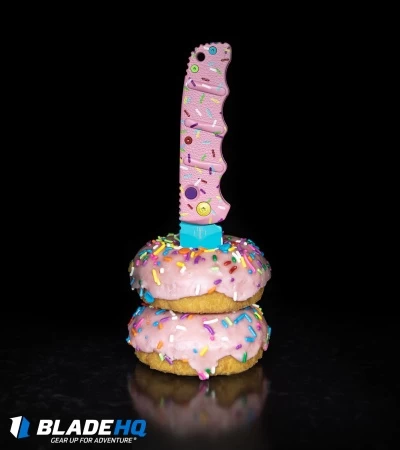 Have you ever been unfortunate enough to have to share a donut? Your plight only gets worse when you find you have to cover your high-speed, low-drag, modified, custom, mirror-edged piece of pocket jewelry in sticky sweetness. What you need is a knife designed from the ground up to go to war with a donut. And although its path to existence was unorthodox, the Dessert Warrior is here! This automatic will snap open before anyone can take more than their half of the donut. The handle is bright pink with sprinkles, and the blade has a candy blue finish, making the knife blend in with the pretty pastries of the shop. Gone are the days of not having the right tool for the job!