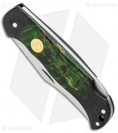 - G-10 handle scales with curly birch inlays offer a lightweight and durable pocket knife.