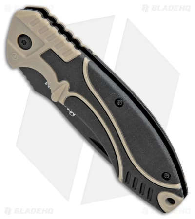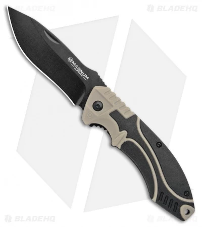 The Boker Magnum Advance Pro Liner Lock knife is a no-nonsense tactical folder with a nail nick. The knife has a tough recurve blade and a black and desert tan polymer handle.