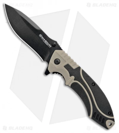 The Boker Magnum Advance Pro Liner Lock knife is a no-nonsense tactical folder with a flipper and dual thumb studs making it easy to open every single time. The knife has a tough recurve blade and a black and tan polymer handle.