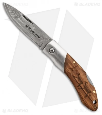 This classic pocketknife from Boker Magnum features a 37-layer Damascus stainless steel drop point blade with nail nick. The stainless steel lock back handle features wooden scales adorned with a primitive hunting scene, reminiscent of cave art.