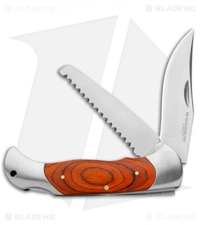 The Boker Magnum Classic Hunter Slim pocket knife is useful for a wide array of cutting and sawing tasks. It features a satin-finished stainless steel clip point blade and a saw. Each lock opens with a lockback system. The handle features stained wood scales, stainless steel liners, and brass rivet construction.
