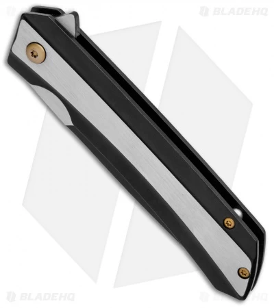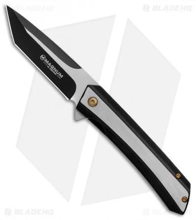 The Contrast from Boker Magnum is a smooth-action flipper knife. Both the 440A tanto blade and the stainless steel handle are two-toned—satin and black. It features gold-colored hardware and a polished tip-up pocket clip.