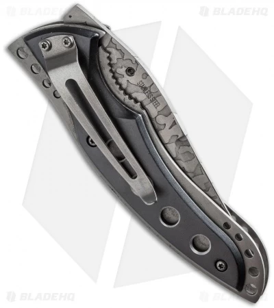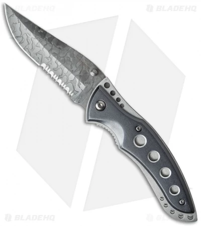 This Attractive folding knife with a high tech appearance. The 440 stainless steel blade features a unique Snowflake Damascus pattern and gray anodized aluminum handles.