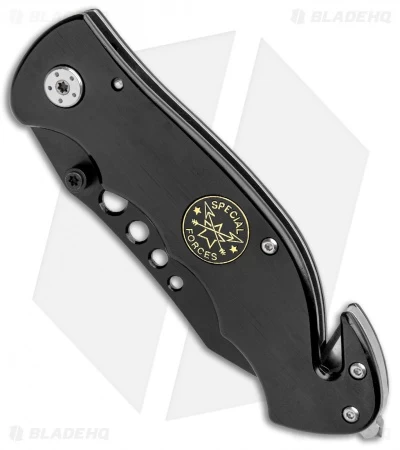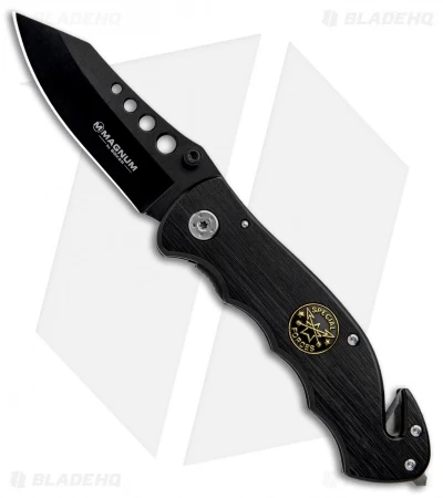 The Boker Magnum Special Forces Black features a black 440A stainless steel blade with stylistic holes and a black FRN handle. The single liner is stainless steel and houses both a liner lock and a belt cutter. A deep-carry, tip-down pocket clip allows for secure carry. The piece is finished with a steel glass breaker.