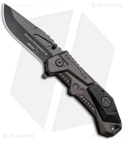 Boker took their popular Kalashnikov Folder design and beefed it up as a massive utility folding knife. The AK-16 is outfitted with a wide blade and a generous thumb ramp with rugged jimping along the spine. It has a heavy duty aluminum handle that provides undeniable grip strength and an ergonomic feel. Solid steel liners and an integrated lanyard hole finish off the impressive utility design.