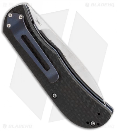 This model is based on the Exskelibur II, a collaborative custom design of Mike Skellern and Fred Burger. It has carbon fiber scales and a premium VG-10 stainless steel blade, marked for the 10th Anniversary. The Exskelibur is a true gentleman’s knife with a slim everyday carry design and quality features like the blue anodized titanium liner and contoured scales. The 440C stainless steel blade has a horizontal satin finish with a hollow grind. The protruding blade grind allows a convenient one-hand thumb opening, and acts as a thumb ramp when the blade is open. The reversible titanium pocket clip completes this everyday carry knife.