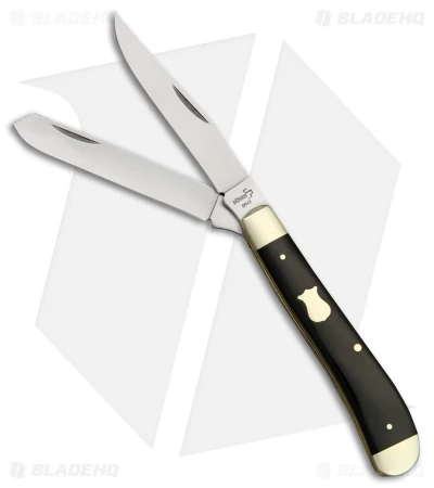 Made of 440C stainless steel, the clip point and spey blades are easily opened with machined nail nicks. Attractive brass bolsters and liners, secure black synthetic handles. An engravable inlayed brass shield can easily be customized for the perfect gift.