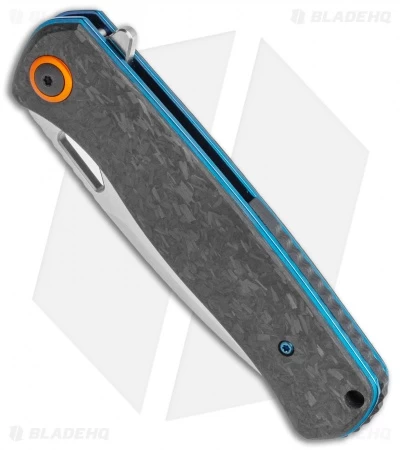 This model of the Nebula has wild carbon fiber handle scales with stainless steel, blue anodized liners and an orange ring around the axle screw.