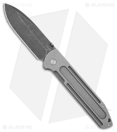 - Drop point blade made from D2 tool steel with a stonewashed gray finish.