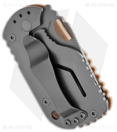 The Subcom F folder is super compact with a blade less than 2″ in length. But don’t underestimate the functionality of power of this compact knife! The blade is AUS-8 stainless steel (bead blast) and features ambidextrous thumb studs. The Subcom F handle is sand colored fiberglass-reinforced nylon and has palm index ramps (a fancy way of saying “texture”) to help with grip. A pocket clip makes carry easy and also works as a money clip. Designed by Chad Los Banos of Hilo, Hawaii.